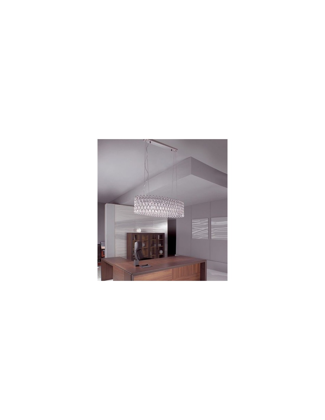 Pendant Lamp that provides an enchanting effect of light between drops in crystal 30% PbO softly embedded in a golden metal mesh, chrome or white.