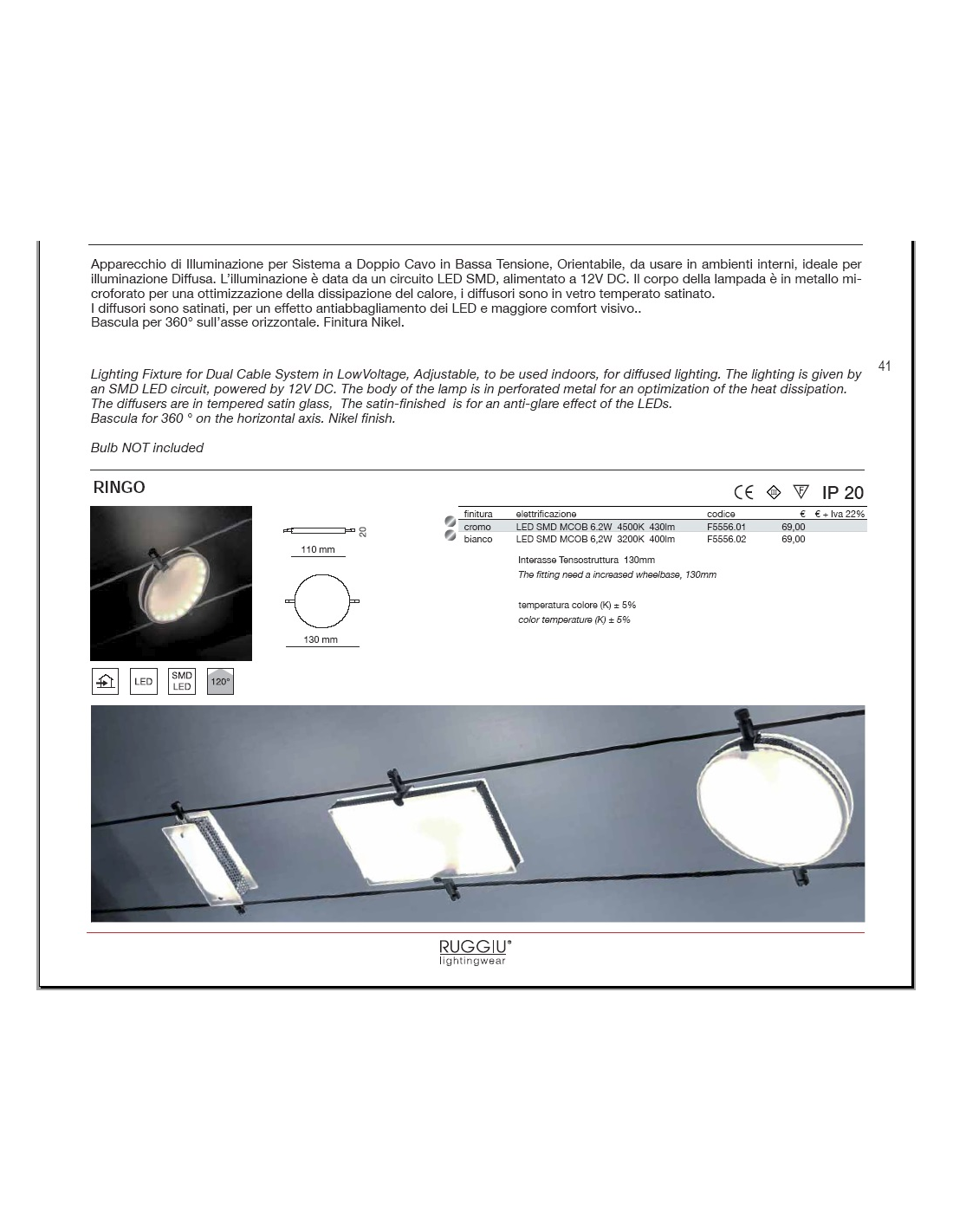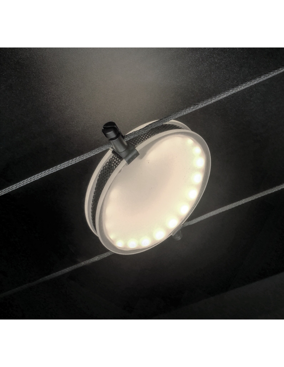 Lighting Unit for Double System Cable to be used indoors. The unit rotates on the horizontal axis and the vertical axis of 350 ° to 180 ° to provide a beam of adjustable light and accent. metal frame, available in polished chrome finish and brushed nickel.