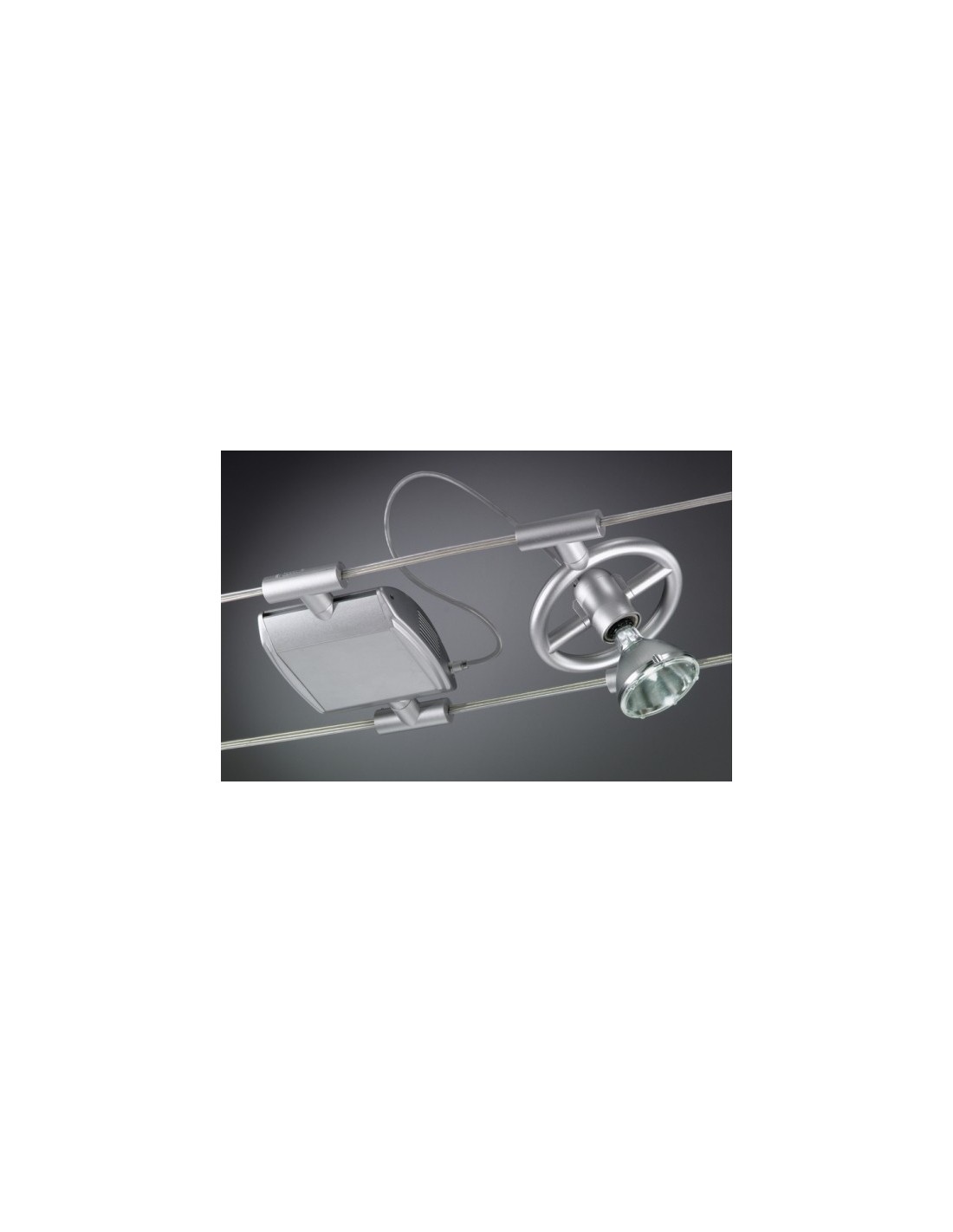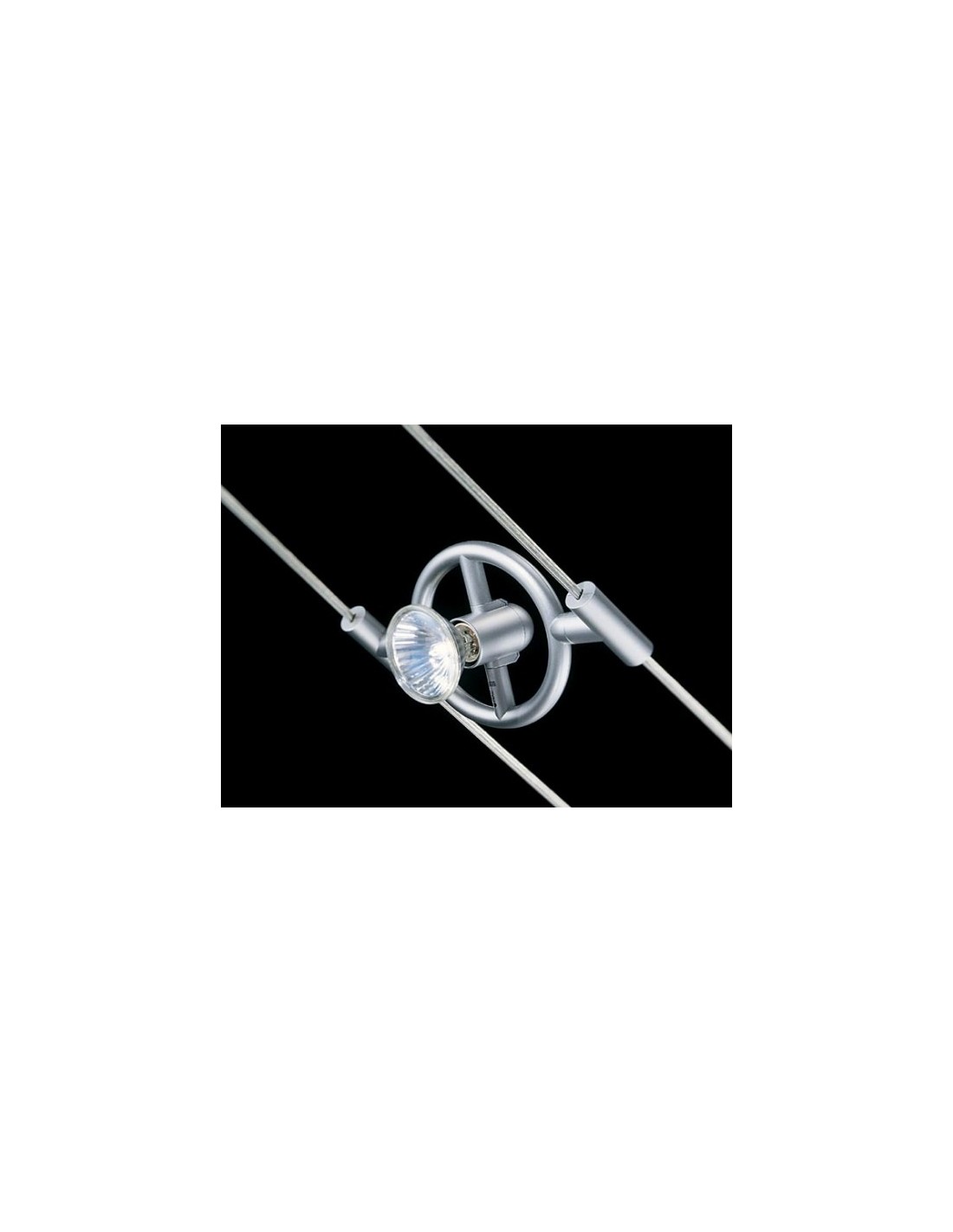 Lighting fixture for double cable system, swivelable, for indoor use, for direct lighting.