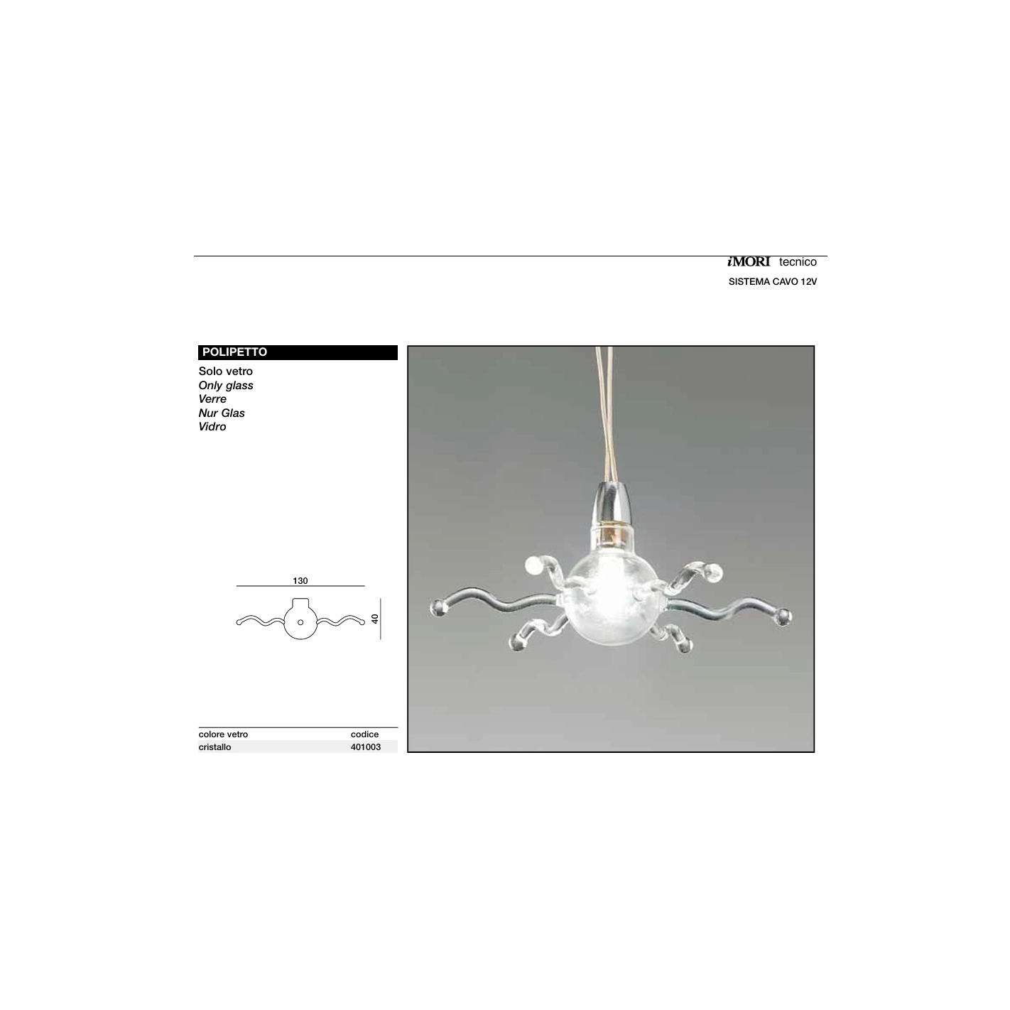 Il diametro del foro per il sostegno con portalampade è di Ø. 10mm per lampadine G4, il diametro totale del diffusore è di Ø. 130mm.