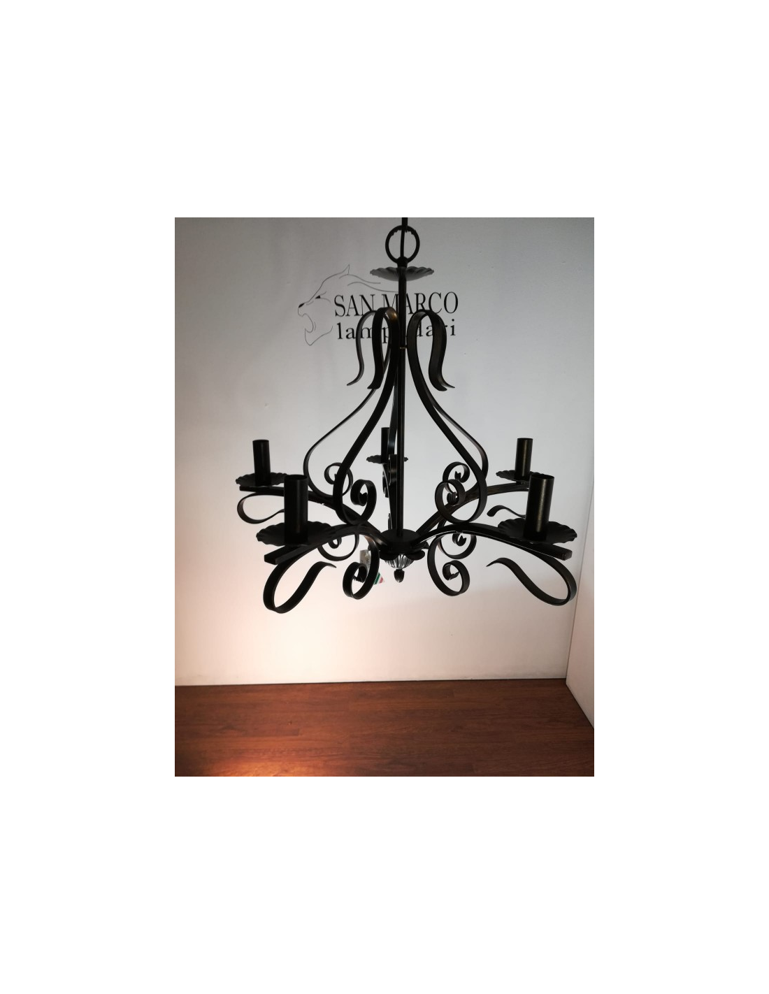 Realizzato interamente a mano in Italia presso le Officine di San Marco Lampadari, storica Azienda del veneziano fondata nel 1960, questo lampadario è dotato di 5 bracci, ognuno composto da una barra piatta a riccio lavorata a mano ed un tubo interconnesso ad esso.
