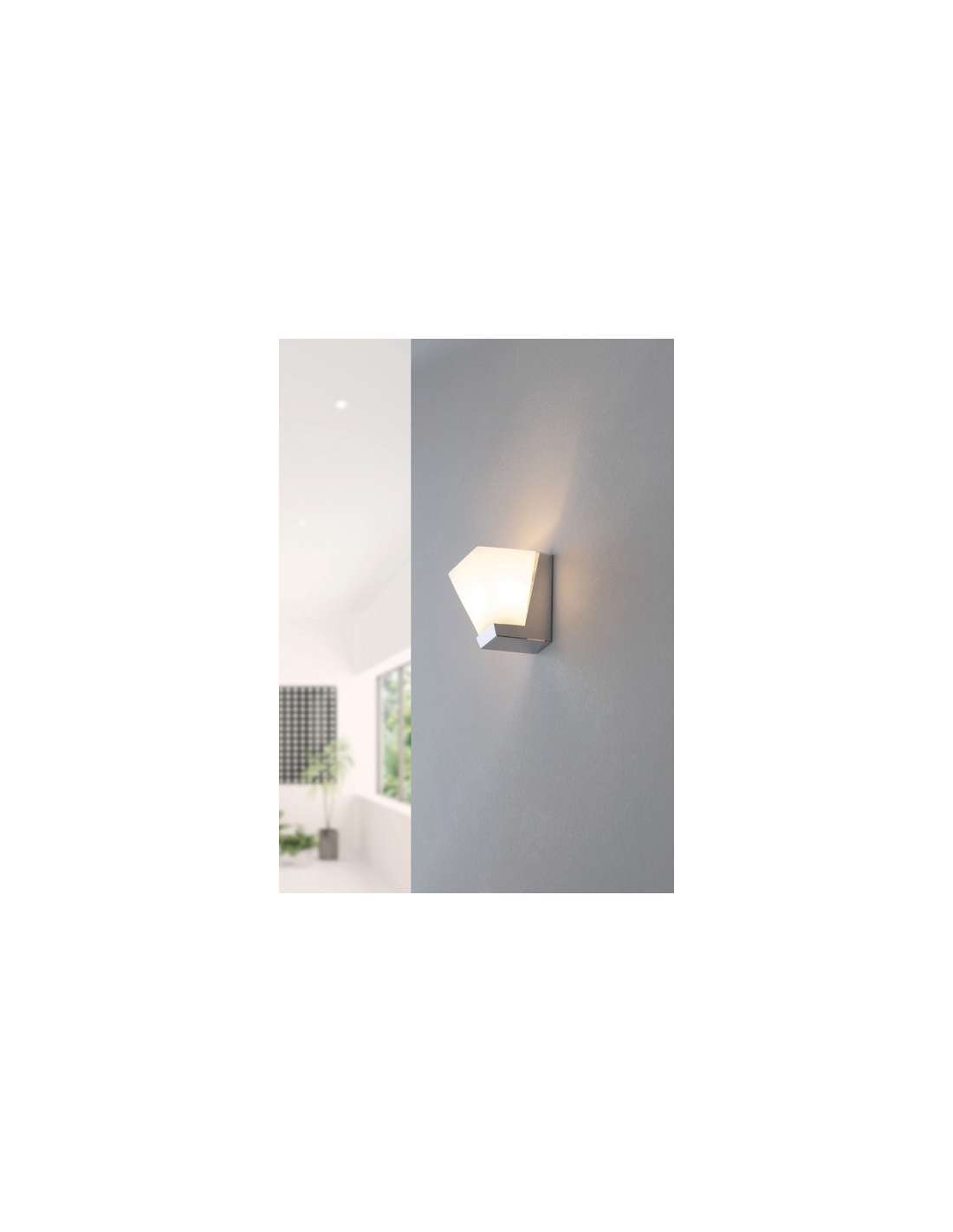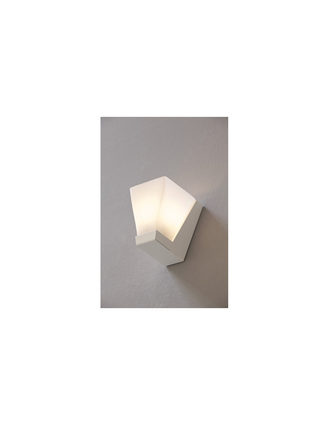 Lampada da parete a luce diffusa. Diffusore in vetro opale satinato. Struttura in metallo verniciato bianco o cromato.