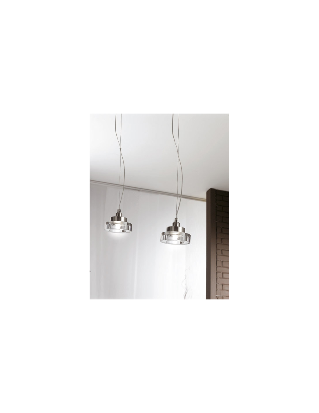 Lampada a Sospensione a luce diffusa, diretta. Diffusore in vetro trasparente, struttura in metallo con finiture nichel spazzolato.