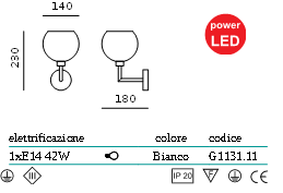 L’illuminazione è data da 2xLED di Potenza 1,2W, luce bianca 6000K, alimentazione in corrente stabilizzata 350mA, alimentatore/driver elettronico escluso. L’apparecchio è disponibile anche con LED di potenza a luce bianca...