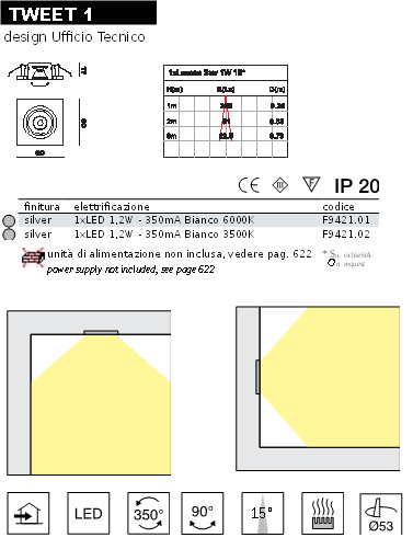 L’illuminazione è data da 1xLED di Potenza 1,2W, luce bianca 6000K, alimentazione in corrente stabilizzata 350mA, alimentatore/driver elettronico escluso. L’apparecchio è disponibile anche con LED di potenza a luce bianca calda 3500K.