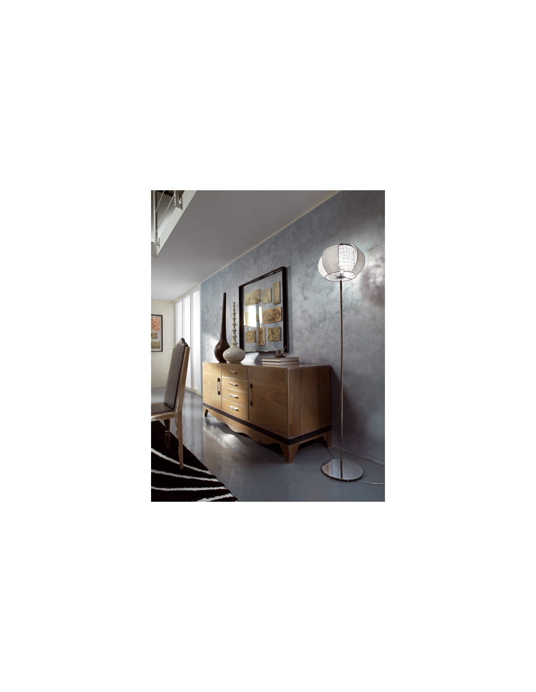 Lampada da Terra a luce diffusa, struttura in metallo cromato. Diffusore in pongè e cristalli sfaccettati al 30% PbO.